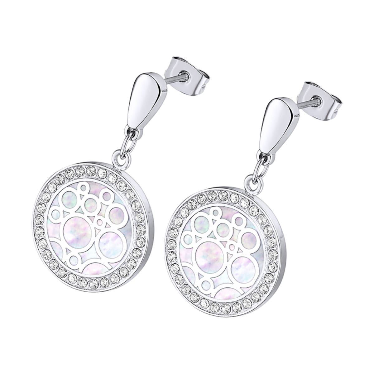 Boucles d’oreilles Lotus Style Bliss pendantes motif rond nacré, orné de strass en acier.