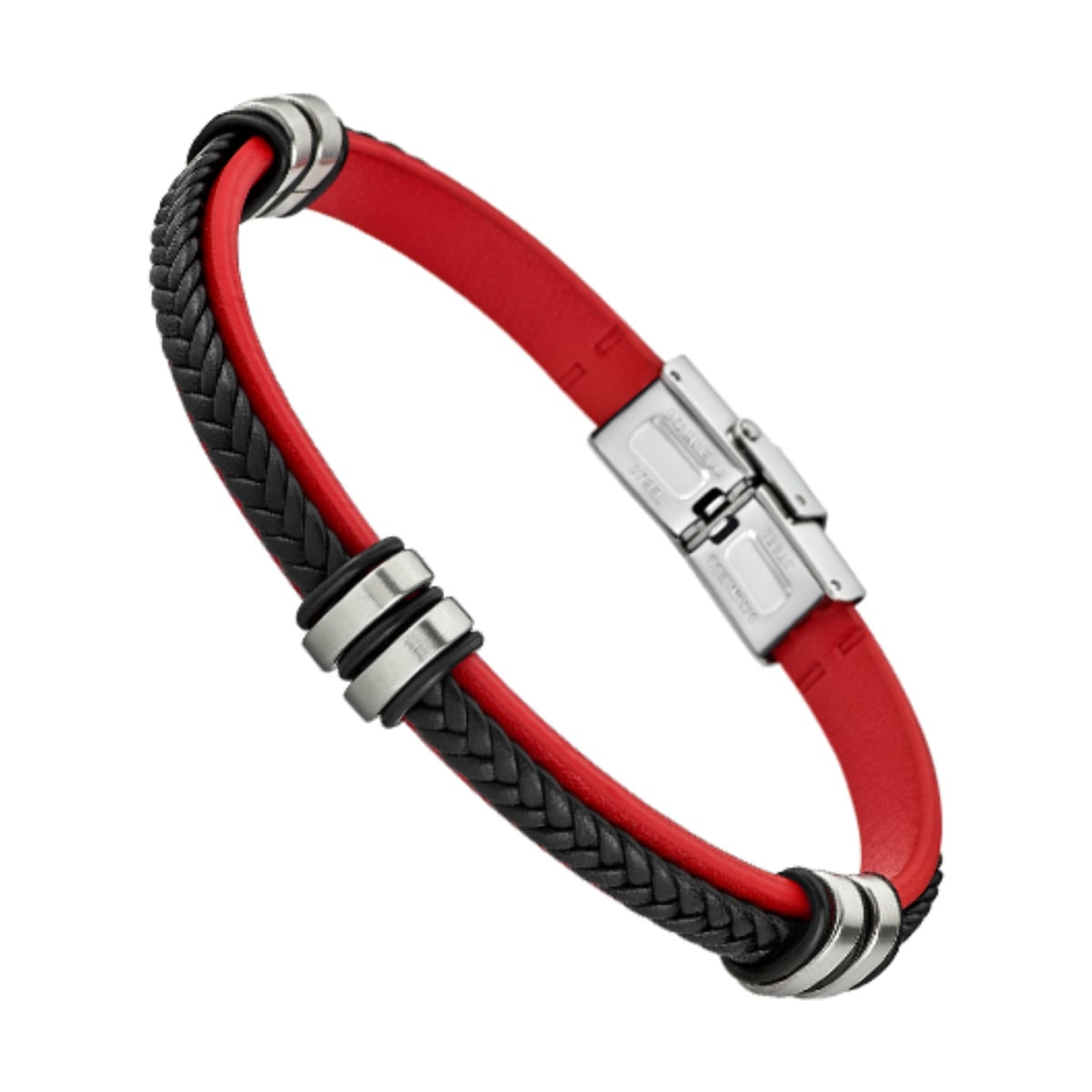 Bracelet LOTUS STYLE pour homme en cuir tressé rouge et noir avec bagues et fermoir en acier. Longueur ajustable