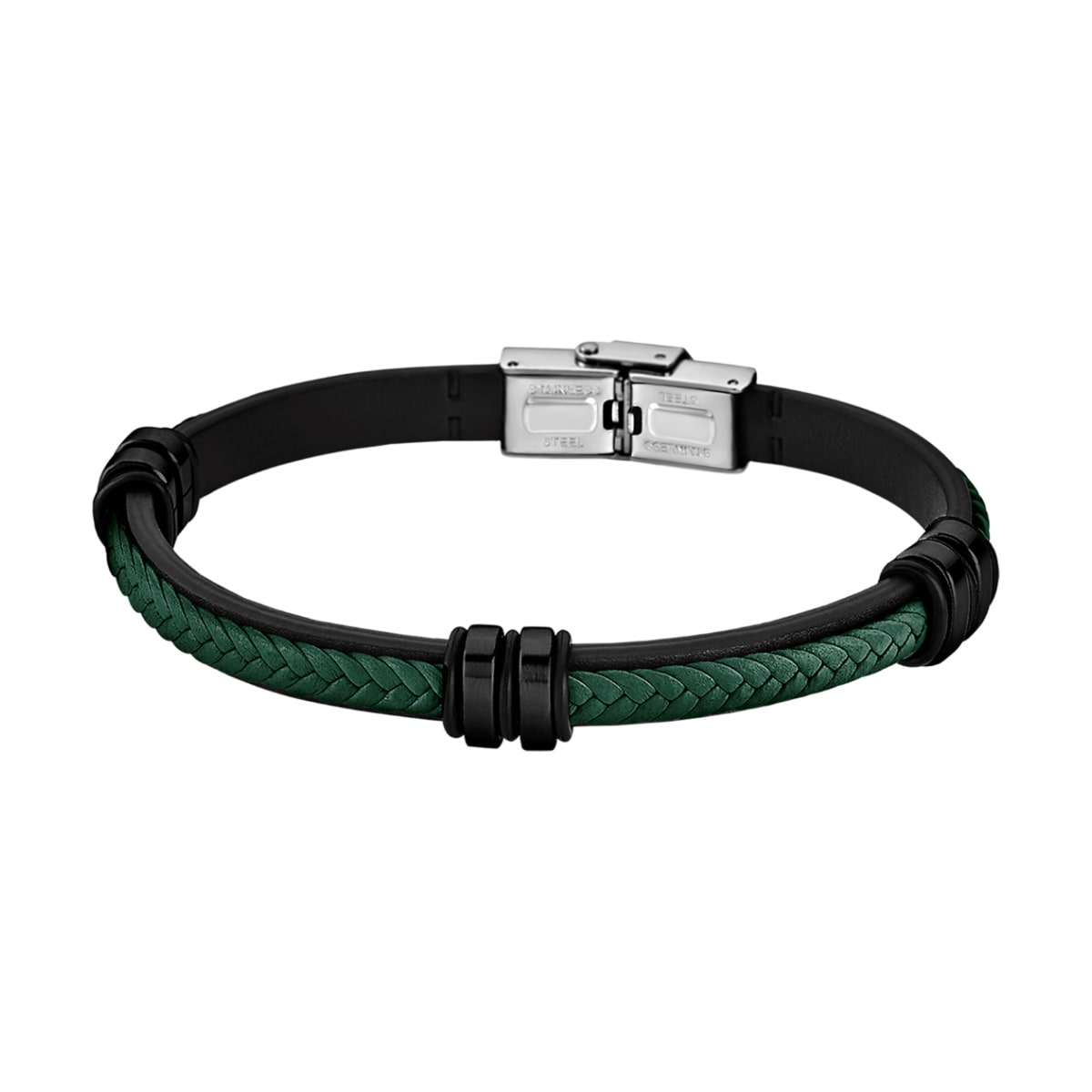 Les prix sont variables suivant le poids, la taille et le cours des matières premières.Bracelet Lotus Style Urban Man en cuir noir et vert tressé avec détails et fermoir en acier noir.