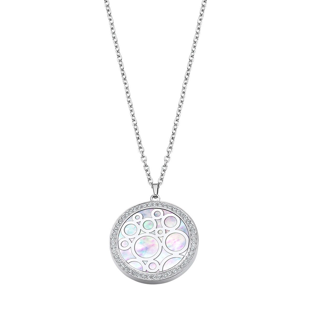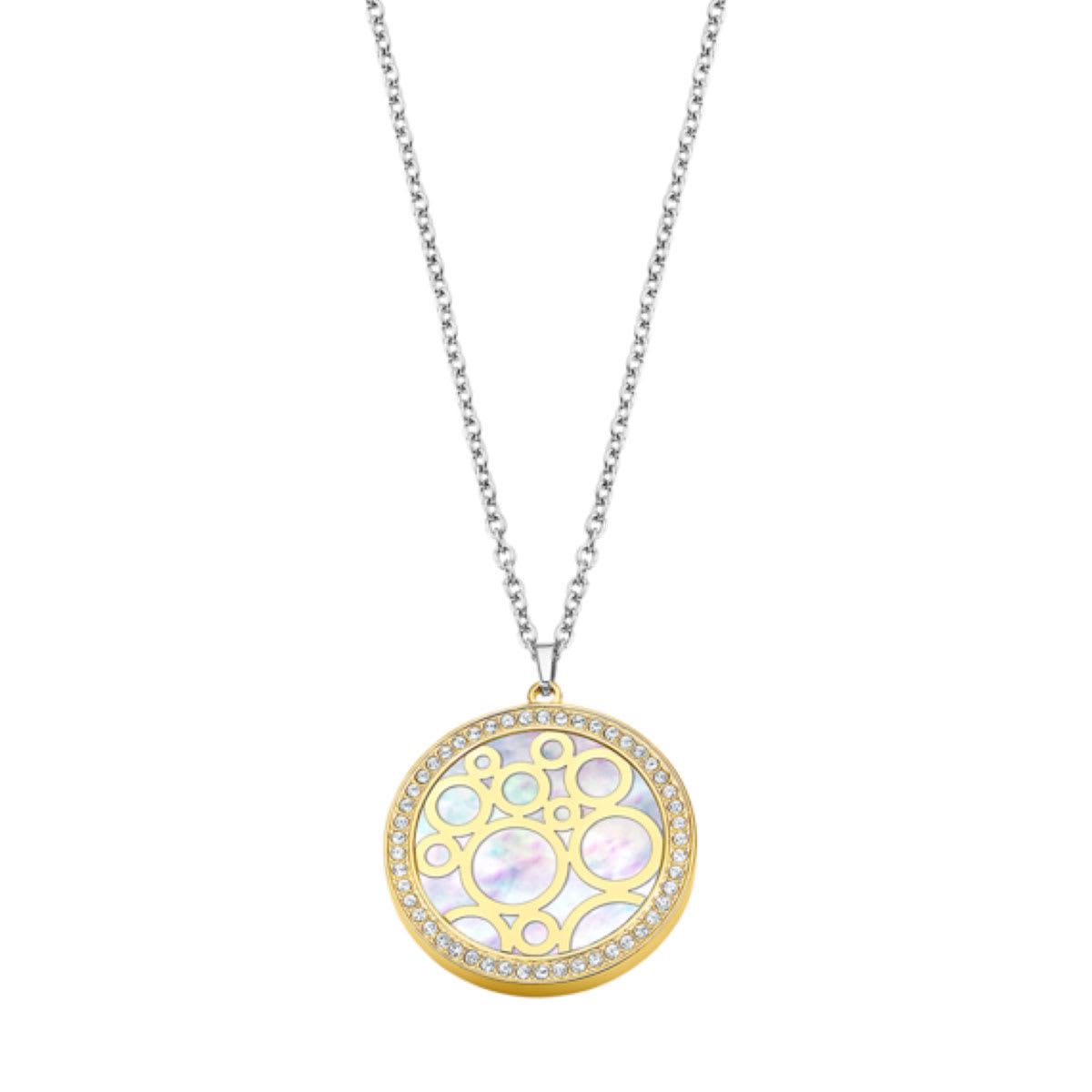 Collier Lotus Style Bliss avec pendentif rond nacré et orné de strass en acier.