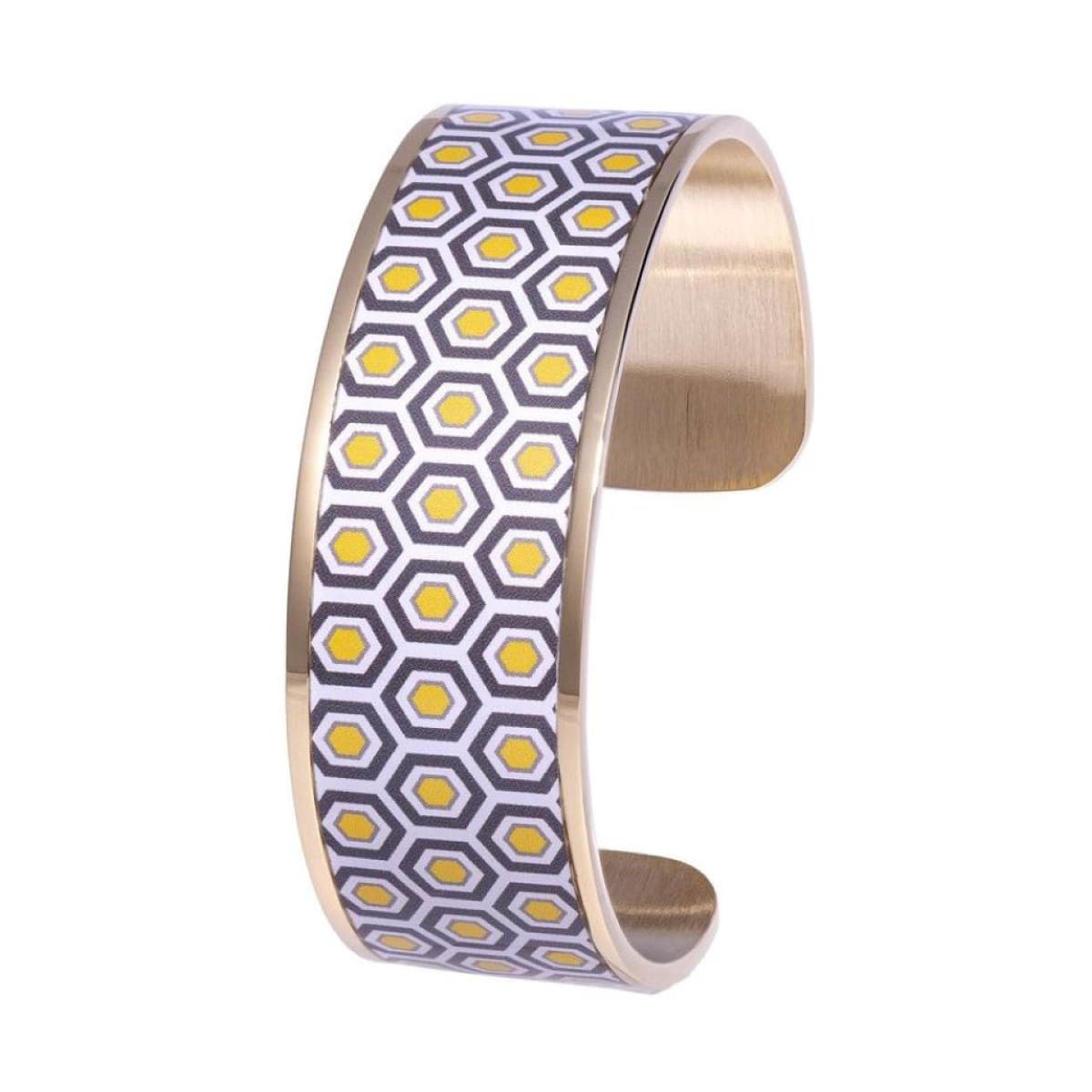 Manchette 22mm en acier doré, à motif graphique nid d'abeilles aux teintes bleu marine, blanc et miel