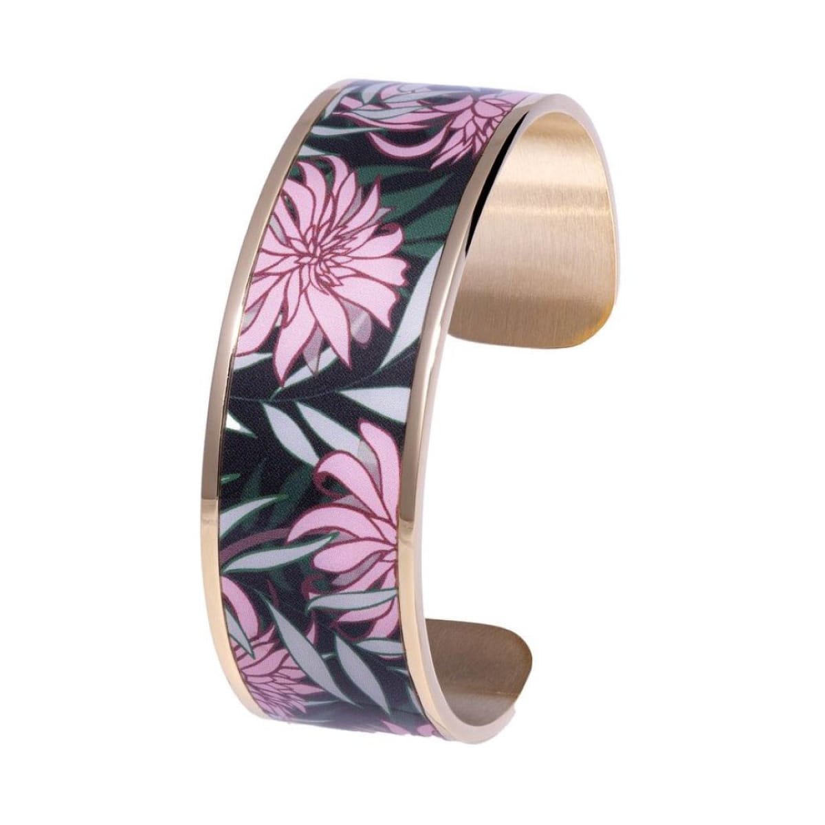 Manchette 22mm en acier doré, ornée de pivoines en dégradé de rose sur fond de végétation vert profond