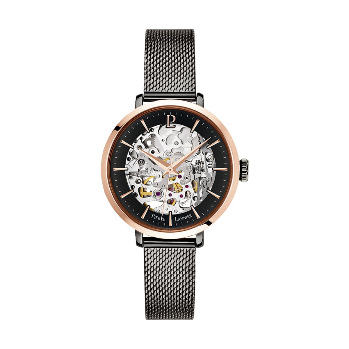 Montre Pierre Lannier Homme ESSENTIAL en acier doré, cadran noir, index et aiguilles dorés.