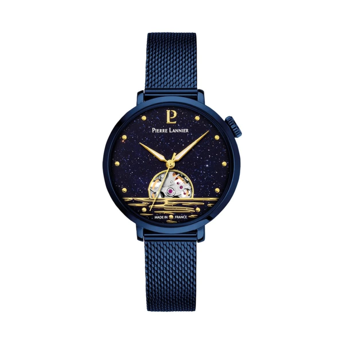 Prix de vente conseilléMontre Pierre Lannier Automatique Femme Australe, cadran bleu pailleté et doré coeur battant avec coucher de soleil, les index et les aiguilles dorés.